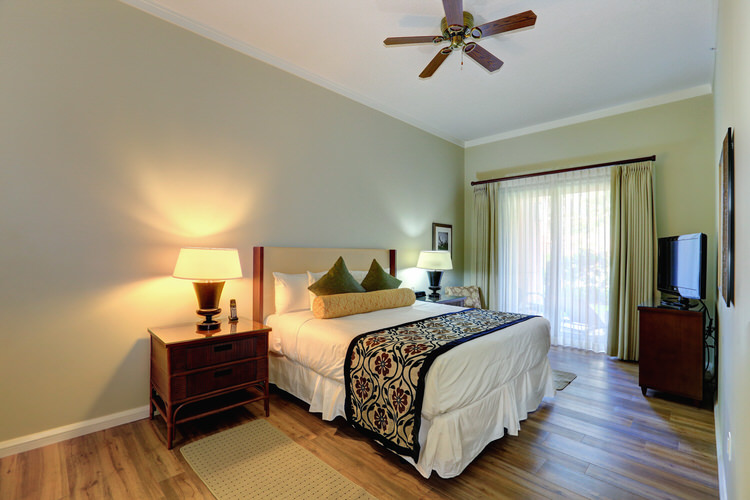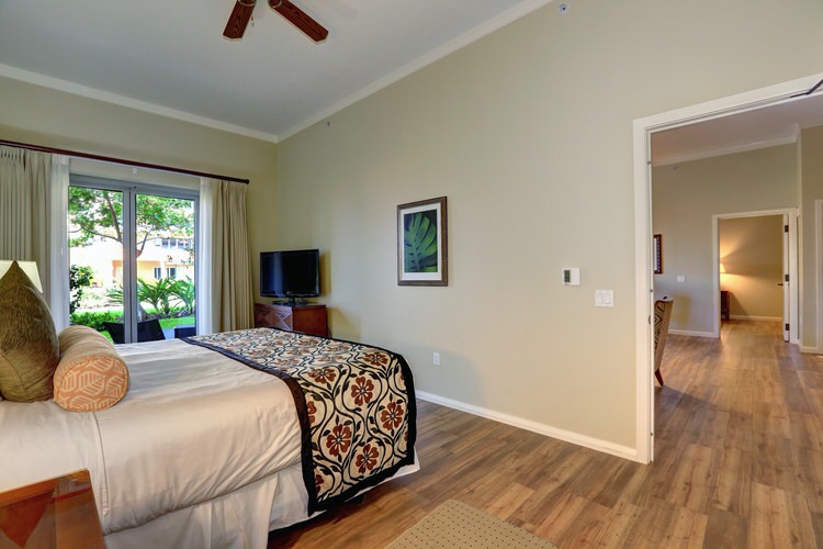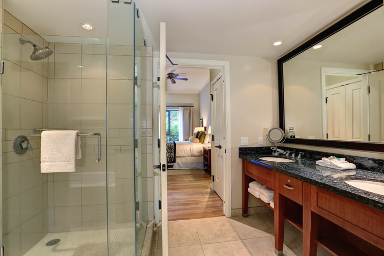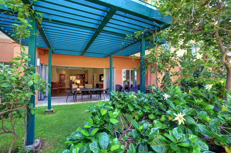 The family friendly Ground Floor units include many bonuses not offered on any of the floors above. Extra tall 11′ ceilings, oversized lanai’s, and very quick and easy access in and out (from the Lanai or condo door) … no elevators needed. The lanai opens up to the a lush garden area, pathways down to the pools, and views of the resort and ocean.